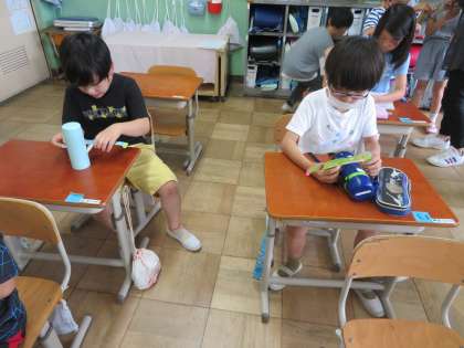 教科書の巻末にある「べんりなものさし」をつかって、水とうの太さや、筆箱の厚さ、腕の幅などを測りました。竹のものさしでは測れないものでも、「べんりなものさし」を使うと測ることができます。測る前にどれぐらいの長さになるか予想しながら測りました。