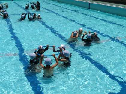 フラフープやビート板をつかって、4〜5名のグループで水遊びを楽しみました。