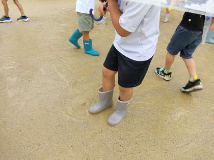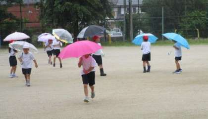 生活科の学習で、雨の日に、運動場に出てみました。傘にあたる雨の音を聞いたり、どろのようになった地面の様子を見たりしました。わざと雨を腕や顔にあてて楽しむ子もいました。