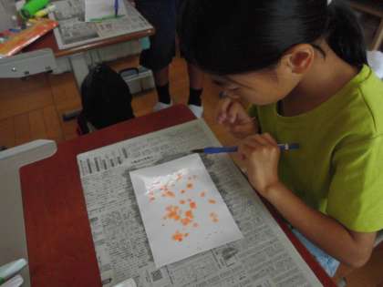 ストローを使って吹き絵をしたり、ふでのついた絵の具を飛ばしたりたらしたりしました。
