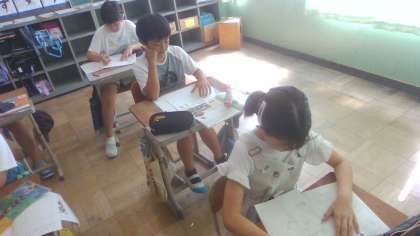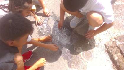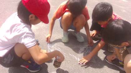 「雨水のゆくえ」の学習で「水はどのように流れていくのだろうか」という課題を立てて実験をしました。地面のかたむきを考えながら、ラップフィルムを敷き、その上に水を流しました。結果から考えたことをプリントに書き込みました。