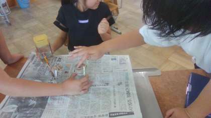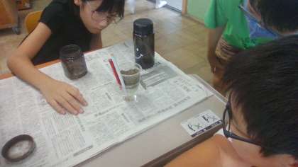今日は、土のつぶの大きさと水のしみこみ方を実験で確かめました。まずは、2種類の土の手ざわりを比べました。そして、実験装置に同時に水を流し、水がしみこんでいく様子を観察しました。