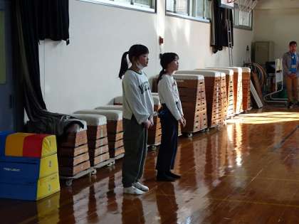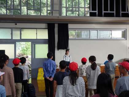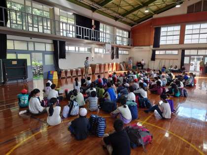 全校の児童と登校時間が同じために、本日はちびっこ広場ではなく講堂に集合しました。