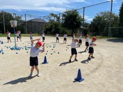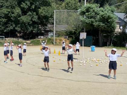 運動フェスティバルに向けて、玉入れとリズムダンスの練習をしています。ジャンボリーミッキーの音楽に合わせて、楽しく踊っていました。このダンスと玉入れがどのように組み合わさるのか、本番を楽しみにしておいてください。