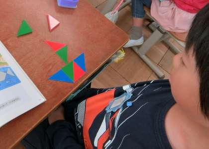 直角三角形の色板や棒を並べて、見本と同じ形を作ったり、使われた色板の数を数えたりする活動をしました。時間の後半には、自分の好きな形を作って楽しむこともしました。