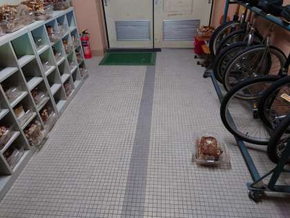 2枚目 迷子のしいたけ・・・か?いや、きっとカビ対策で、風通しのよいところへ一時的においているのちがいない。でも、ここはろう下。通る方はお気をつけください。
