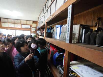 消防分団の器具庫を見学させていただいたり、消防団の普段の活動や火事・災害が起こった時の活動について詳しくお話していただいたりしました。
