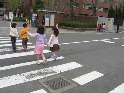 京都工芸繊維大学からは4人ずつのグループで横断歩道の渡り方や,歩き方に気をつけて学校まで帰ってきました。お世話になったお迎え当番とお帰り当番は19日で終わります。20日からは今日学習したことを生かして安全に気をつけて登下校してほしいと思います。