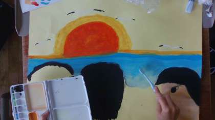 図画工作科「忘れられない気持ち」の学習で、心に残っている場面を絵にかき表しています。