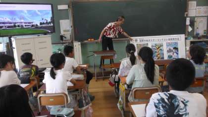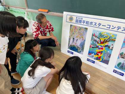 岩澤先生にお越しいただき、平和ポスターのお話を聞かせていただきました。平和をイメージできるものと自分が好きなことなどを混ぜて描いたらよいことや、これまでの作品の様子、選考についてなども教えていただきました。みんなそれぞれ自分のイメージを膨らませることができました。