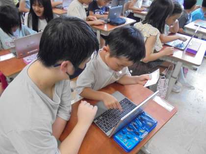 今回は、担任のコンピュータから子どものコンピュータにクイズを送り、その答えを担任に送り返すという活動をしました。6年生が教室に来て、わからないことや操作のしかたを優しく教えてくれました。