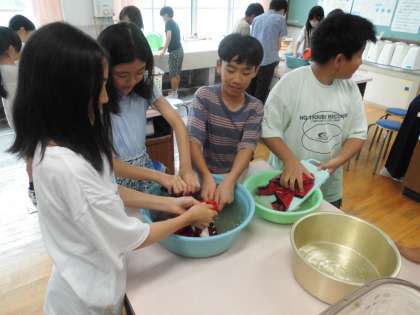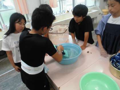 家庭科で洗濯の実習をしました。もみ洗いをしたり洗濯板を使って洗ったりしました。洗っていると水が濁って「うげっ!」「汚れが出てる。」と目に見えない汚れを実感しながら洗っていました。それぞれの家で予洗いをする場面にも役立ちそうです。