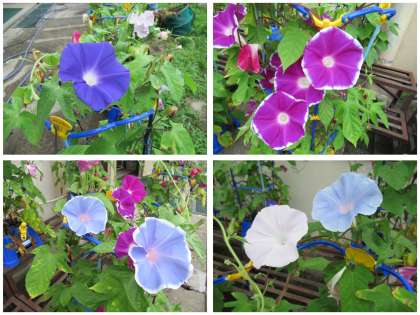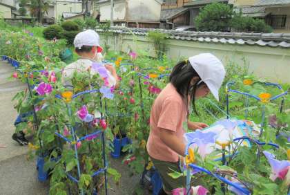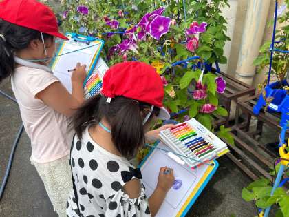 1年生が生活科の学習で育てているあさがおの花がきれいに咲きました。あさがおの色や形、大きさをよく見たり、触ってみたり、匂ってみたりと、子どもたちもわくわくした様子でした。