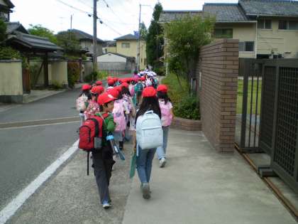 2年生が,1年生とともに動物園に向かって,元気よく出発していきました。