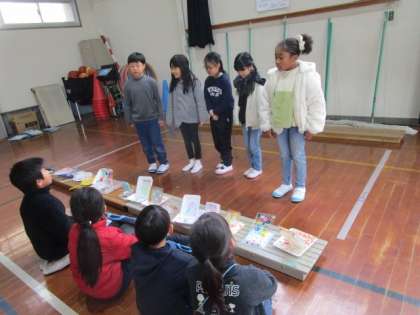 今日は、「なかよしフェスティバル」のリハーサルをしました。1組と2組で交代しながら、お店屋さん役とお客さん役をしました。