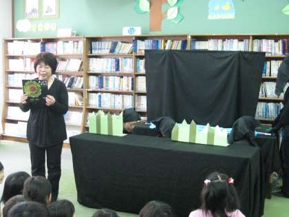 今月は,「まっくろネリノ」のお話を,読み聞かせに人形劇をまじえて行ってくださいました。