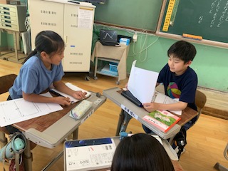 友だちのことをもっと知るために、その友だちの興味のあることや得意なことなどをくわしく聞いたり、質問される方は、質問の意図や内容をよく聞いて答えたり、その2人のやりとりを聞いて、報告書にまとめるために記録をとったりしました。