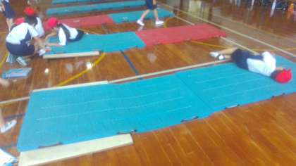 「マットあそび」の学習では、マットの上でできるいろいろな動きを考えて試しています。