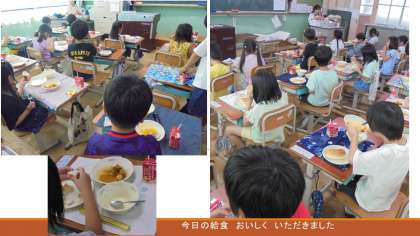 今日の給食はスパイシーチキン!「カレーの味がする」と言いながらおいしそうに食べていました。
