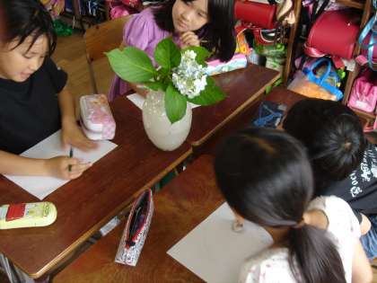 図工であじさいの花を写生しました。花の色をよくみてかいています。