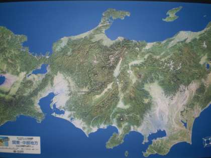 本館西階段手すり上に,ランドサットから見た立体地図が掲示されています。