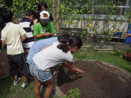 小さいたねをとても大切にまく子ども達。やさしい表情でした。「思いを込めて作物のお世話をすると味がかわる・・・」と言うことを教えていただきました。芽がでるまで,水をたっぷりとあげるといいそうです。今から,とても楽しみにしています。
