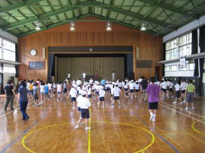 全校ダンス担当教師の指導のもと,全校ダンスの係の児童が舞台に上がって,全体にお手本を見せながら練習しています。