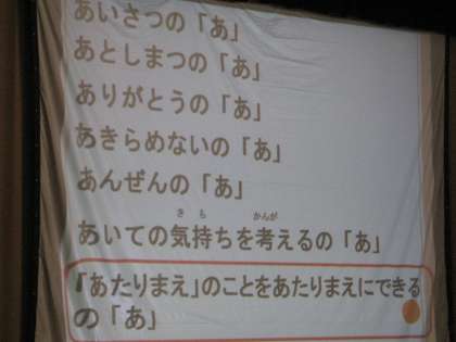 その後,「当たり前のことが当たり前にできる」子どもになっていってほしい。今までの「6つの『あ』にこれを加えて「7つの『あ』」としていく旨の話がありました。