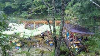 野外炊事場の全体の写真です。子どもたちは食事を終えて,分担して後片付けをしています。