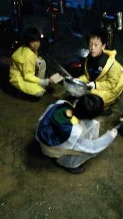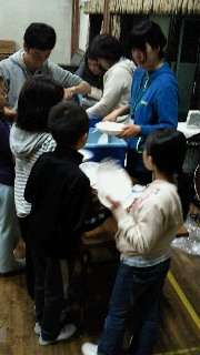 お湯を沸かして,夕食の準備です。ご飯の配給も段取りよく出来ました。