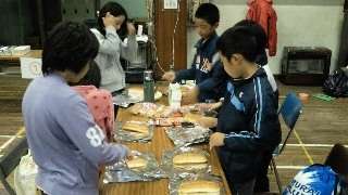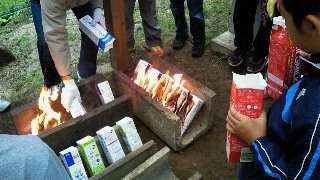 朝食のパックドッグ作りです。牛乳パックに入れて,焼きます。