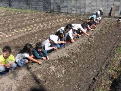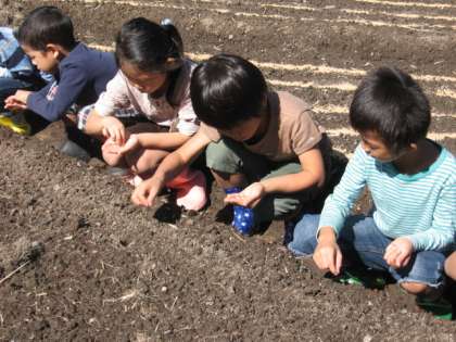 手渡してもらった種を大事そうに持った子どもたちは,種がかたまらないようにパラパラと少しずつまいていました。