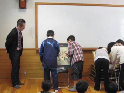 現代美術作家の岩澤有徑さんをゲストティーチャ—にお迎えしての,学校運営協議会学び企画推進委員会による「小学生のための現代美術教室」が,3年生と6年生を対象に1時間ずつ,今日の午前中に開かれました。今年度で3回目となります。