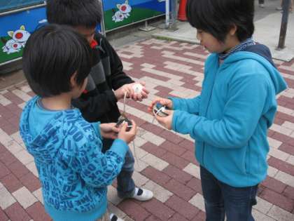 それぞれのグループの2年生に,糸の巻き方,こまの持ち方,こまの投げ方などをとても丁寧にやさしく教えてもらいました。