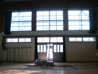 窓が取り換えられ,キャットウォーク(ギャラリー)の手すりも取り付けられ,東側の正面入り口上部の暗幕も取り付けられています。