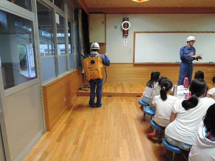 学校に泊まろうには,もしも地震などの災害が起きたら,学校に避難し学校で泊まらなければならないので,その経験をしてみよういう目的もあります。そこで松ヶ崎消防分団芝山分団長に「防災のお話」していただきました。