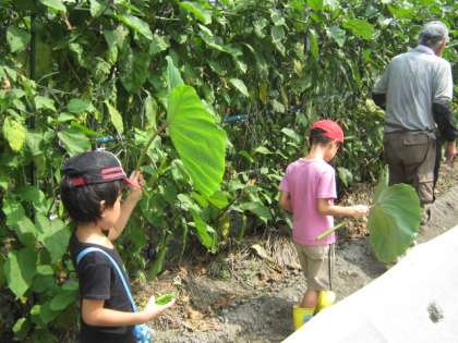 大きなサトイモの葉をもらい,とても嬉しそうに持って歩いていました。