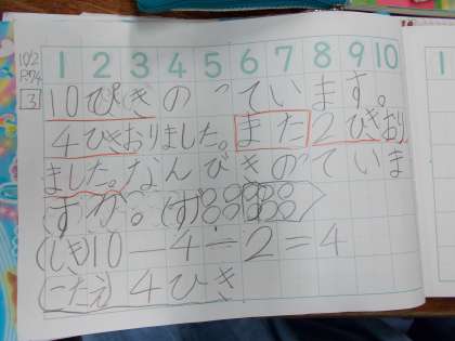 4月に1・2・3〜と数を数えることから学習を始めた1年生ですが,今では自分で式の考え方を図で表し,3つの数の計算ができるようになりました。ノートもしっかりと書きまとめることができるようになりました。