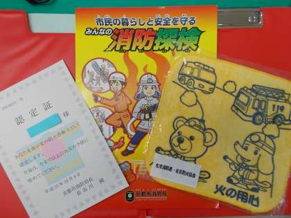 最後に消防署から,消防署の仕事についてのパンフレット,ハンカチ,認定証をいただきました。