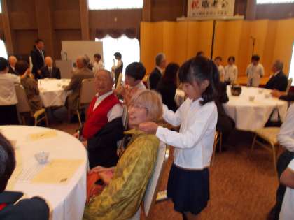 グループごとに行事の紹介をした後,お年寄りの方々に肩たたきや肩もみをしました。ただ肩たたきをするだけではなく,「おかげんどうですか?」と子どもたちなりに声をかけてコミュニケーションをとっていました。