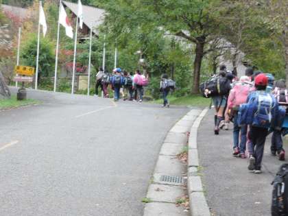 山の家に到着しました。一人もバスに酔うことなく元気に宿泊棟に移動です。