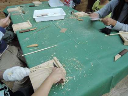 最後の仕上げにペーパーをかけています。小刀の使い方もさまになってきました。みんなとても上手にマイおはしを仕上げることができました。今日の夕食から竹ばしを使って食事をします。