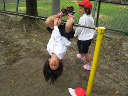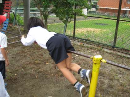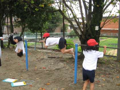「いもむし」の技に挑戦しています。この後,鉄棒から下りず(地面に足をつかず)に「おさるさん」や「地球回り」,「こうもり」から「こうもりふり」へと技を続けます。