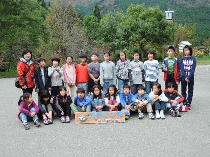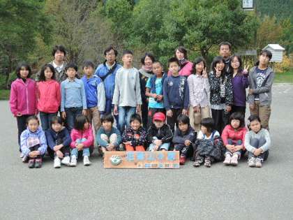 自然観察の後玄関前で「雲取山」をバックに各クラス集合写真を撮りました。