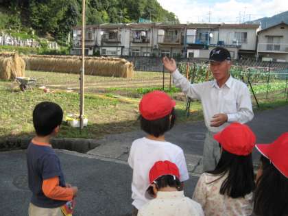 1年生が種をまいた後ろには,先日三宅さんが種をまかれた菜の花が,かわいい黄緑色の芽を出していました。