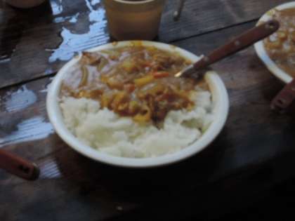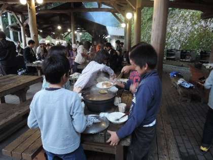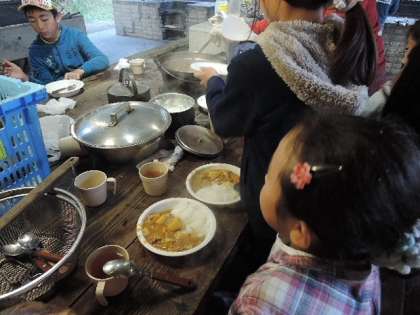 第1炊事場で野外炊事をしました。はじめてのカレー作りです。どの班もおいしいカレーが出来上がりました。(活動中の写真は,カレー作りを手伝っていたためとれませんでそた。申し訳ありません)
