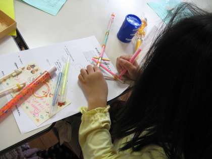 割りばしでゴムでっぽうを作っていました。ペンで色も塗っていました。