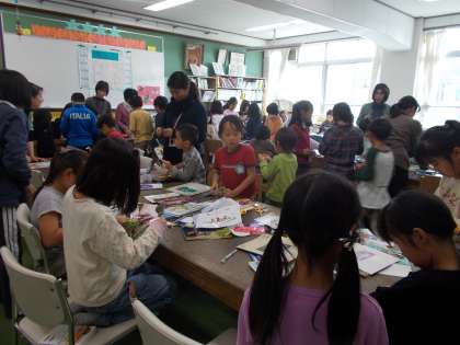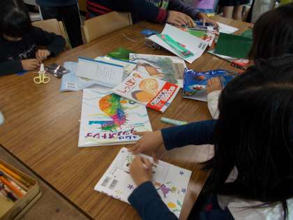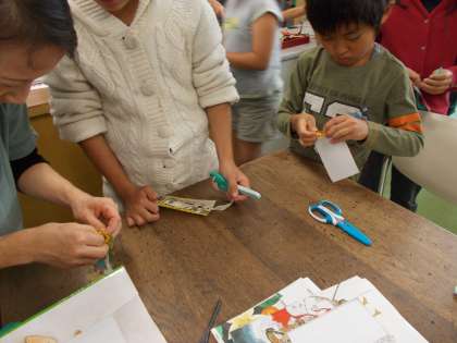 本日昼休みに図書室で「しおり」作りをしました。たくさんの子どもたちが参加して楽しんで作っていました。図書支援員の先生や運営協議会読書企画委員のみなさんにお手伝いいただきました。
