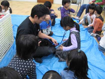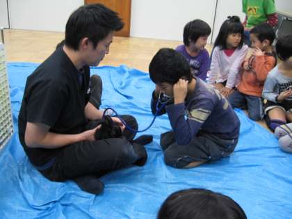 うさぎさんをなでたり,うさぎさんの鼓動を聴診器で聞かせてもらったりしました。
