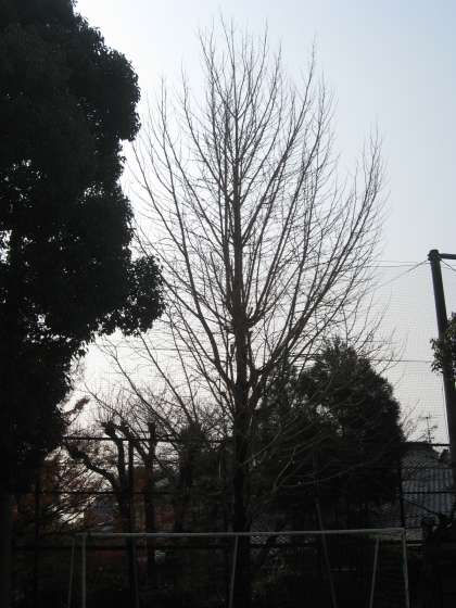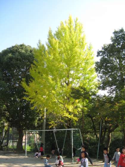 てつぼうあそびやなわとびなどをはじめ,1年生の姿を見守っている校庭のイチョウの木が,1か月でこんなに変わりました。